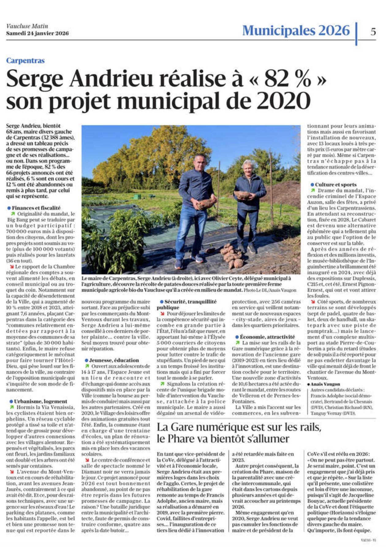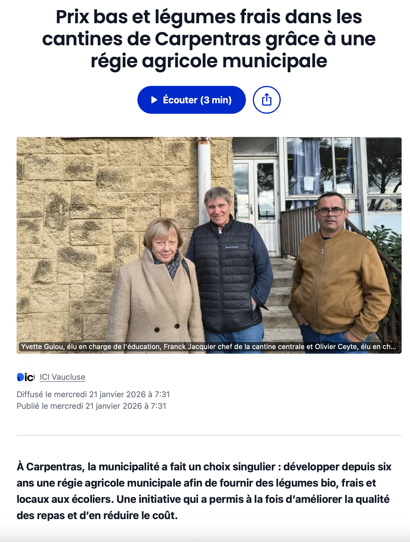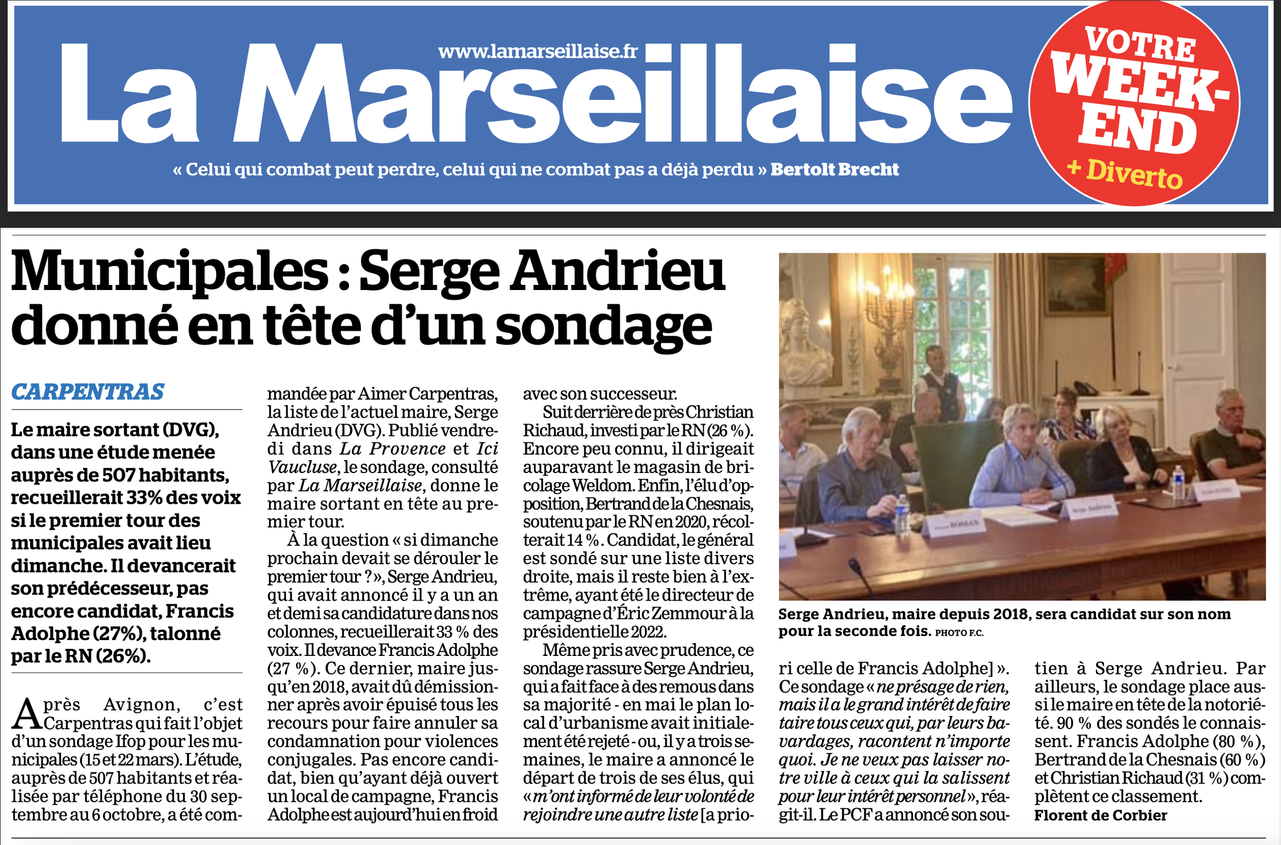 REVUE DE PRESSE Retrouvez ici les principaux articles de presse concernant notre liste ICI Vaucluse Prix bas et légumes frais dans les cantines de Carpentras grâce à une régie agricole municipale. La Marseillaise Municipales : Serge Andrieu donné en tête d’un sondage La Provence Une mairie disputée à quatre et un défi face à l'extrême droiteSerge Andrieu, la partage du pouvoir comme leitmotivUn sondage commandé par Serge Andrieu le donne en te du 1er tour Vaucluse Matin Serge Andrieu réalise à 82% sont projet municipal de 2020Police, santé, jeunesse, comment Serge Andrieu veut prendre soin de la ville ICI VAUCLUSE LA MARSEILLAISE LA PROVENCE VAUCLUSE MATIN