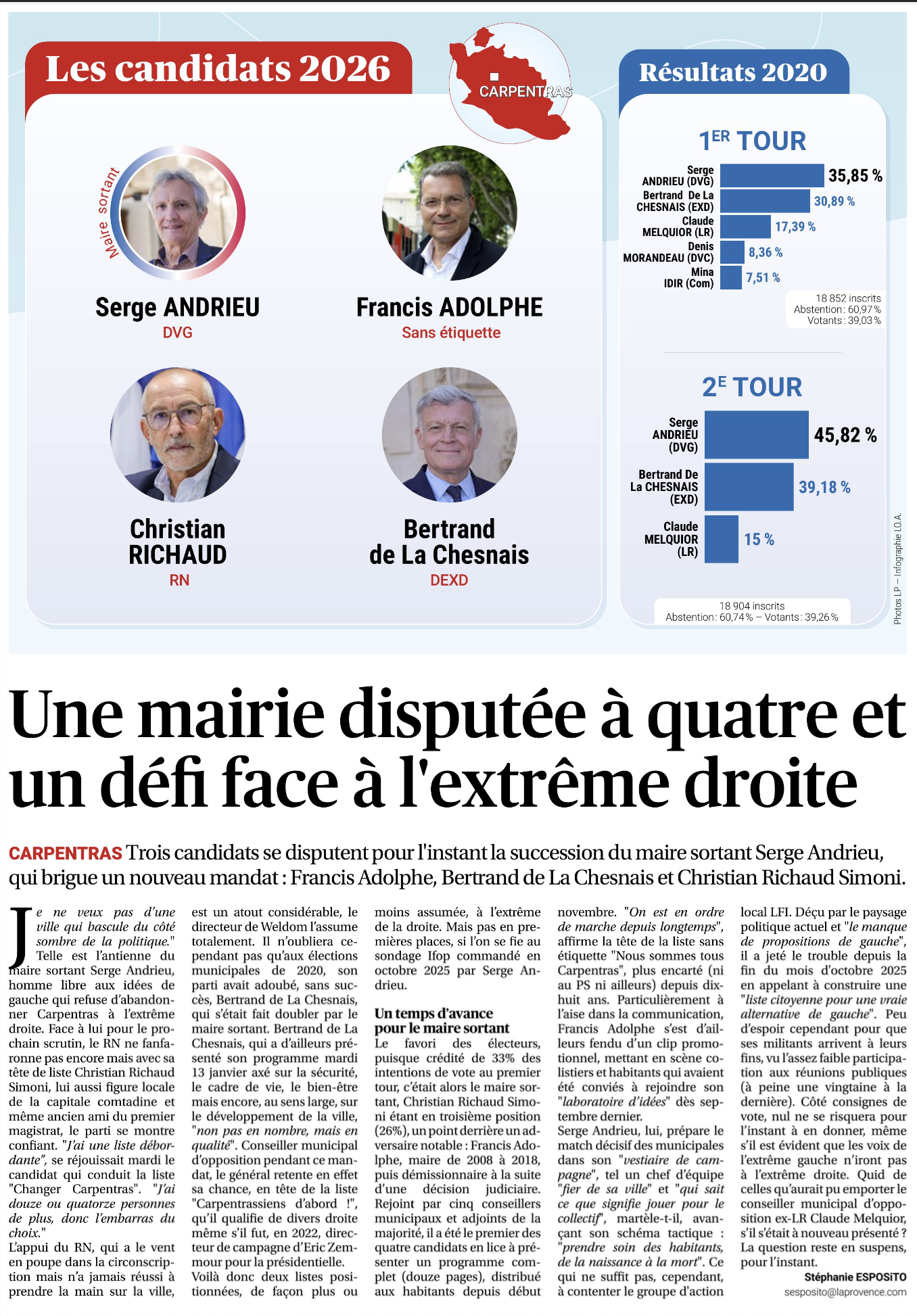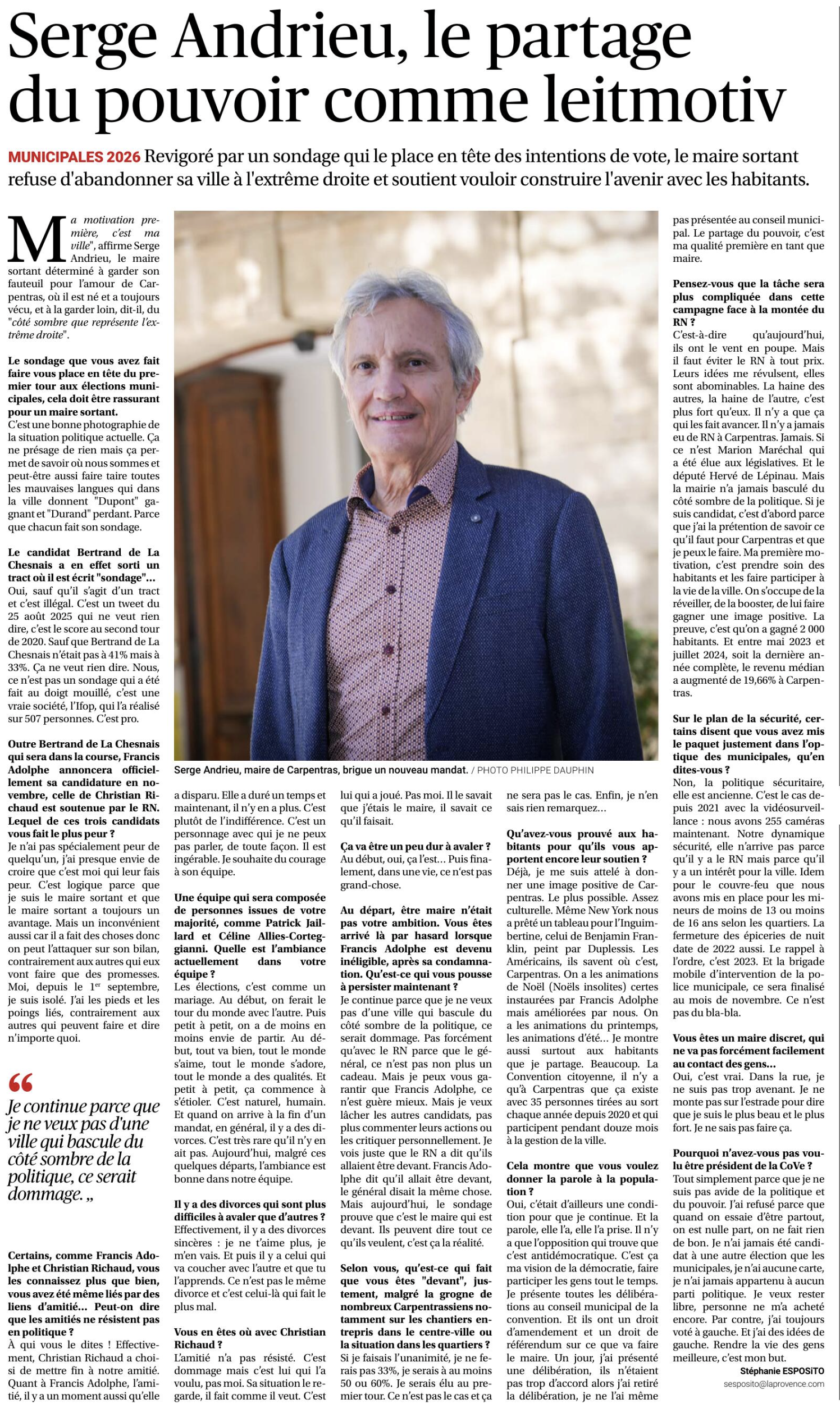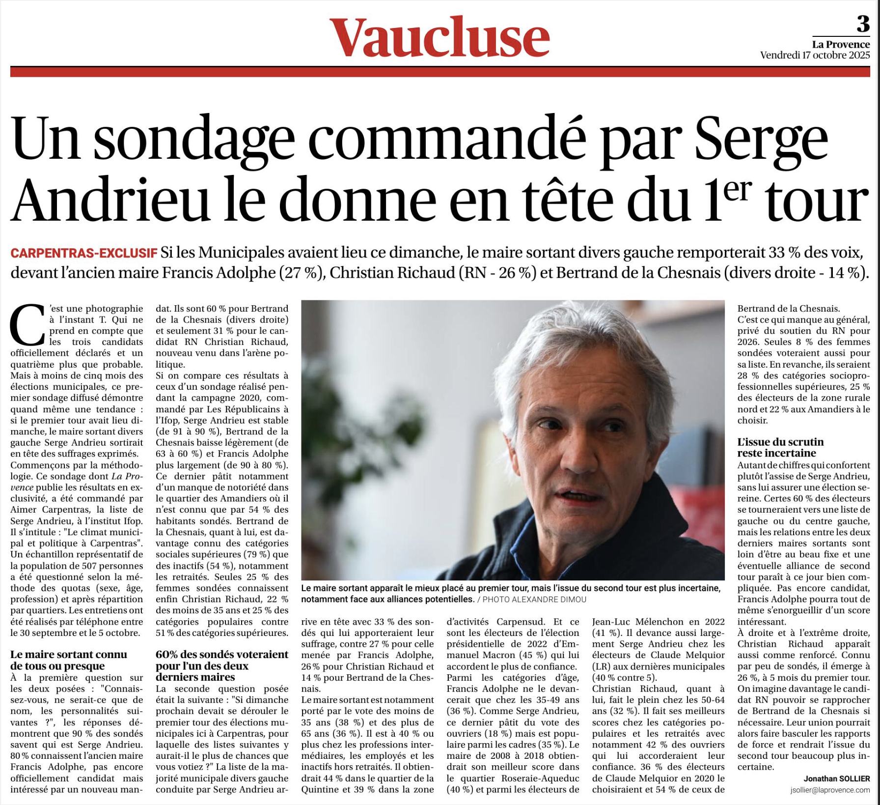 REVUE DE PRESSE Retrouvez ici les principaux articles de presse concernant notre liste ICI Vaucluse Prix bas et légumes frais dans les cantines de Carpentras grâce à une régie agricole municipale. La Marseillaise Municipales : Serge Andrieu donné en tête d’un sondage La Provence Une mairie disputée à quatre et un défi face à l'extrême droiteSerge Andrieu, la partage du pouvoir comme leitmotivUn sondage commandé par Serge Andrieu le donne en te du 1er tour Vaucluse Matin Serge Andrieu réalise à 82% sont projet municipal de 2020Police, santé, jeunesse, comment Serge Andrieu veut prendre soin de la ville ICI VAUCLUSE LA MARSEILLAISE LA PROVENCE VAUCLUSE MATIN